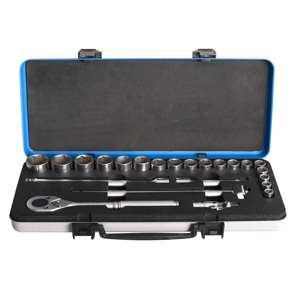 – 18 kom. šestougaonih nasadnih ključeva 1/2″ (art. 190/1 6p), dim. 10, 11, 12, 13, 14, 15, 16, 17, 18, 19, 20, 21, 22, 23, 24, 27, 30, 32 mm