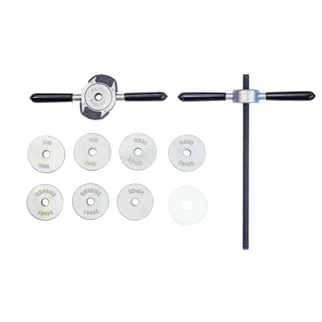 - sadrži prese za sve najčešće korišćene sisteme patrona pogona bez navoja (eng. Press-fit) i BB30 patrone – Sram DUB, BB30, BB86/BB92.